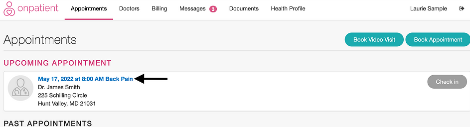 Log into your OnPatient account and navigate to the “Appointments” tab on the navigation bar.