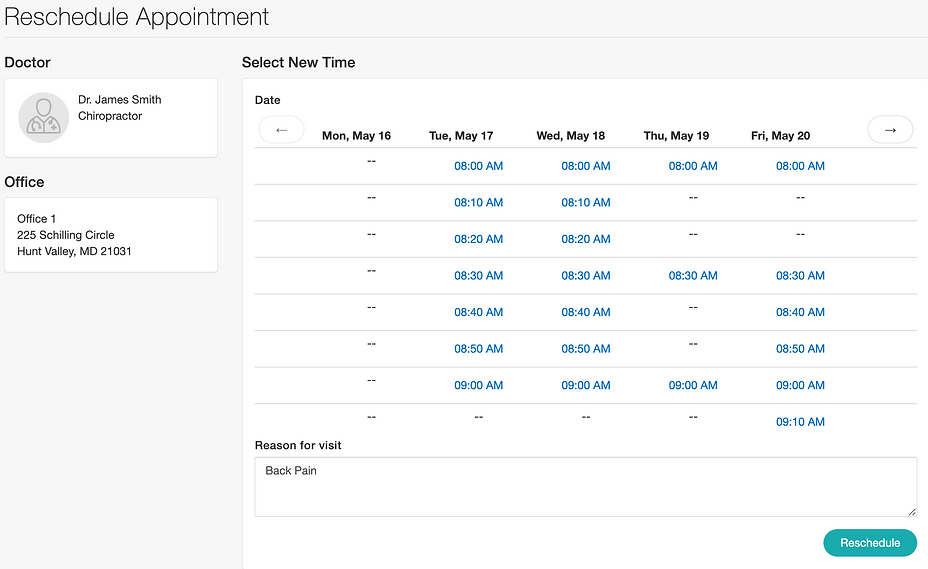 After clicking “Reschedule,” you will be directed to a scheduling tool where you can select a new appointment time based on our availability.